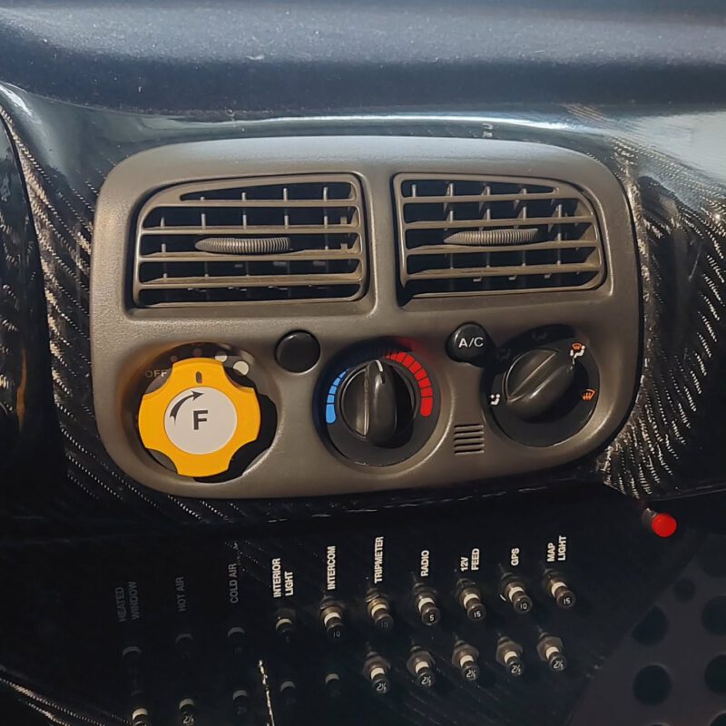 Inside the rallycar everything of heavy metal is removed and replaced by lightweight materials like aluminium. So is the driver footrest for the drivers left foot. Reverse engineered from an original part featuring the single column of holes on the front like on the Group A Impreza (Legacy had same shape but 2 columns!).
